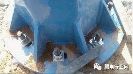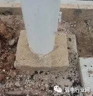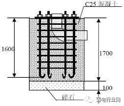 (6)杆件立好后,杆件的基础需要用混凝土将整个基座完全包封,以免螺丝在时间暴露在空气中导致生锈。在用水泥将螺丝封好之前,需将接地角铁跟杆件的法兰盘焊接好,如下图要求所示: