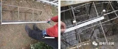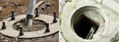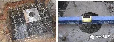 (3)基础与杆前手井之间应有穿线管,使用 PE 管,条件允许建议使用镀锌钢管,使用双管布设,强弱电分开走,且放置预留铁丝。先将铁丝的一端弯成不封口的圆圈,再将铁丝穿入管路内,在管路的两端均应留有 10~15cm 的余量。