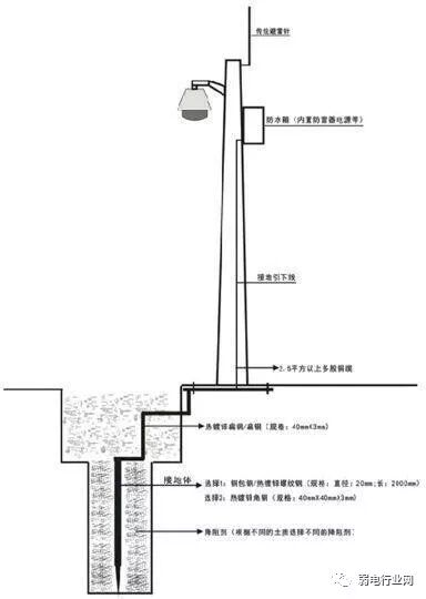 前端监控点的防雷接地接地电阻要达到4Ω以下,必要时需要在基础的附近增加接地体或补加接地桩,或使用降阻剂等手段达到接地电阻的标准。立杆整体接地形式如下图: