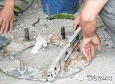 根据合同签订的要求浇筑相应标号的混凝土,混凝土浇筑到大概总方数的3/5 时,放置固定杆件的地笼,一定要注意把基础笼子上方的法兰盘压至水平位置,且法兰盘要求和下面的混凝土紧密接触,切忌留有缝隙,存在缝隙时,笼子螺杆会因为杆件的摇摆而破损,导致发生事故概率增加,过程如下图: